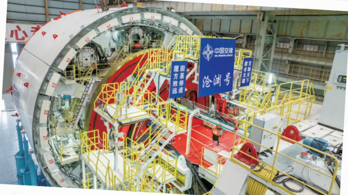 “沧渊号”盾构机的命名源于“龙起于渊”典故,大海古称沧渊,寓意着盾构机犹如蛟龙入江,以其强大水下施工力量通江达海,所向披靡。其整机最大开挖直径达16.66米,整机总长176米,主机重量约5600吨,再创国产超大直径盾构机新纪录,其智能化、国产化技术彰显我国高端装备制造与超级工程建设的全球领先水平。