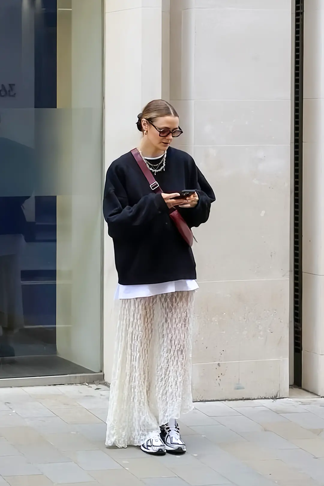 想要在生活场景中驾驭「发疯美学」,多类型单品的堆砌容易出错,可以先从两种不同类型的组合入手。任何与卫衣运动感冲突的服装或者配饰都可以,比如:蕾丝、羽毛、流苏等。▼