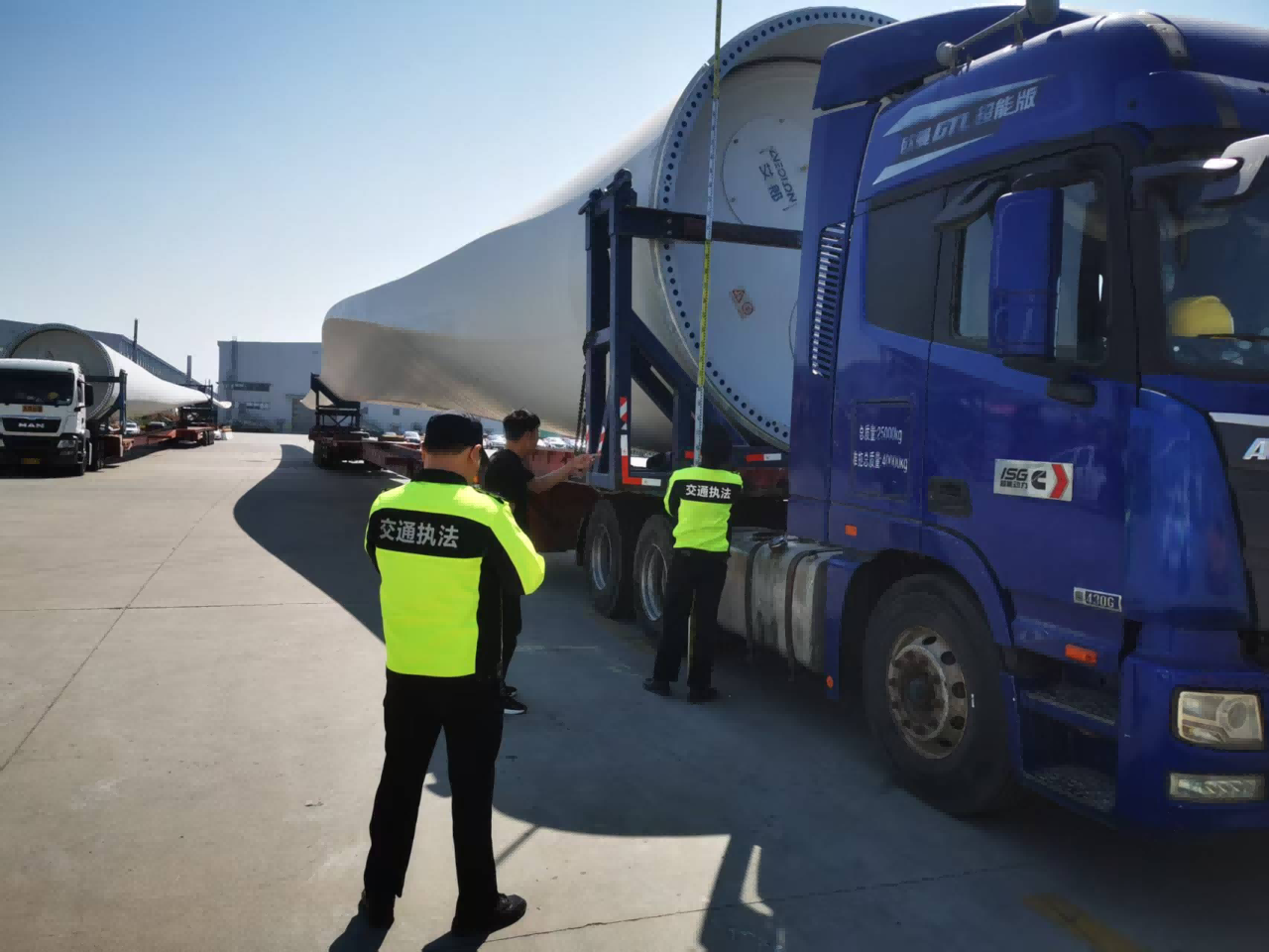 另一路执法小组直奔东灶港作业区,对3辆申请大件运输的车辆进行勘验。执法人员严格对照《超限运输车辆行驶公路管理规定》,对货物外形尺寸、轴载质量等核心参数进行实地测量,逐项核查运输许可证件及护送方案。通过“现场勘验+系统比对”双重机制,确保运输车辆符合“合法装载、安全通行”的硬性标准,从源头消除道路安全隐患。